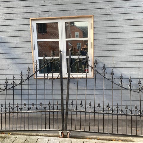 2 stk Jernport i sort metal med dekorative elementer. Porten består af flere sektioner med buet top og spydspidser. Velegnet til udendørs brug som indgangs- eller haveport.