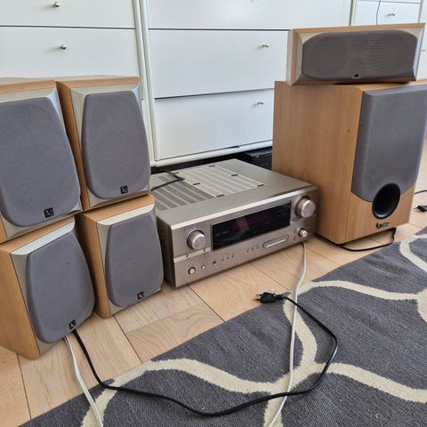 AVR 3805 surround forstærker. Med DVD /CD. 7 x 120 watt i 8 ohm. Mange mulige indstillinger alt efter afstand og størrelse af højtalerne. Kan også sættes op, så der er lyde i to rum. Med manual.