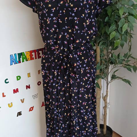 En kjole med flot snit og usynlig lynlås på ryggen. 2 lommer foran. Kjolen er i viscose (97%) og elastan (3%). Længden fra nakken og ned målt på ryggen er 95 cm, brystmål er 2x54 cm.