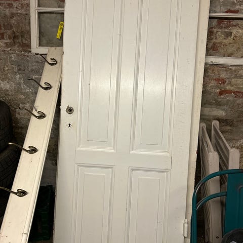 Hvidmalet trædør uden karm. Døren har klassisk paneldesign og er egnet til indvendig brug. Materialet er træ, og døren er velegnet til renoveringsprojekter eller som erstatning for eksisterende dør. Vi har 2 stk. hvor lille sælges for 350kr. og stor 200kr. Fra andelsbolig (1800 tallet) i København. Kan afhentes på Østerbro