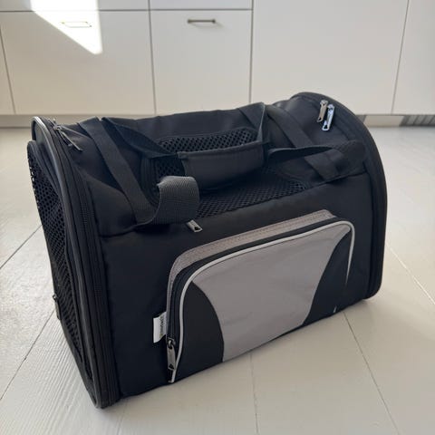 Fin og funktionel rygsæk til at bære lille hund eller hvalp. Brugt få gange. Fejler intet. Der er krog til at sætte i hundens sele, og åbningen at rygsækken kan strammes ind. Der er justerbare stropper og mave spænde til personen der har rygsækken på. Grå og sort i farven.