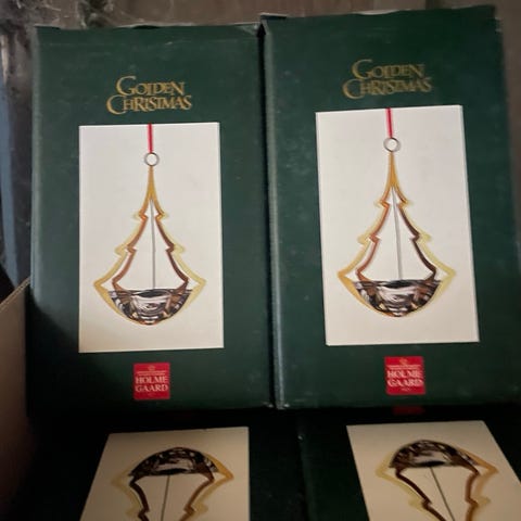 Årets julestager fra forskellige årgange i form julekugle og juletræ samt julestjerne i guld fra Holmegaard.