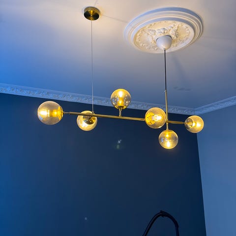 Fin spisebordslampe i messing. Brugt, men i god stand. Sælges pga. flytning. Medfølger 5 x pærer.