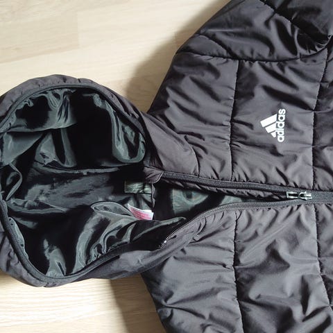 Addidas nej. Grøn med refleks nister. Den sidder meget stram på min datter som er på vej ud af str 176 og kompakt bygget.