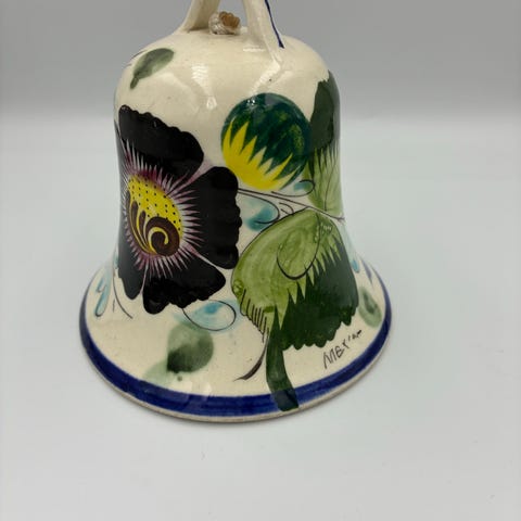 Fin håndmalet keramik klokke med blå og hvid glasur.