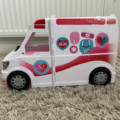 Barbie Ambulance legetøj i hvid og pink farve, inklusiv en Barbie-figur og forskellige medicinske tilbehør. Ambulancen kan åbnes og indeholder detaljer som båre og medicinsk udstyr. Egnet til rolleleg og udvikling af fantasi hos børn.