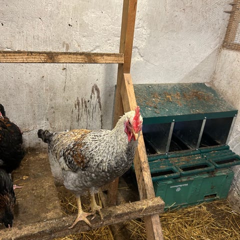 De galer smukt (især når de synes, solen burde stå op lidt tidligere 😅) og er vant til et roligt hønseliv.