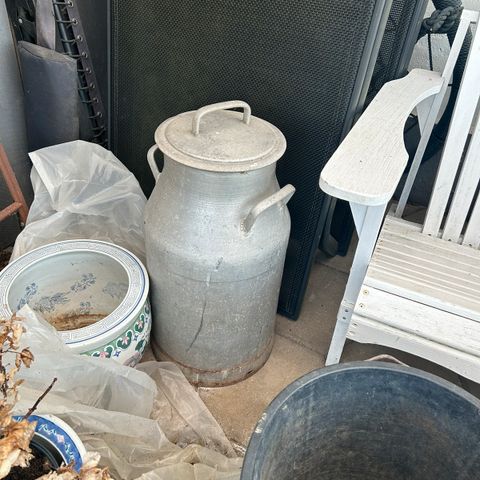 Mælkejunge med låg og to håndtag i fin stand, velegnet til opbevaring eller udsmykning. Er malet i mat grå farve.