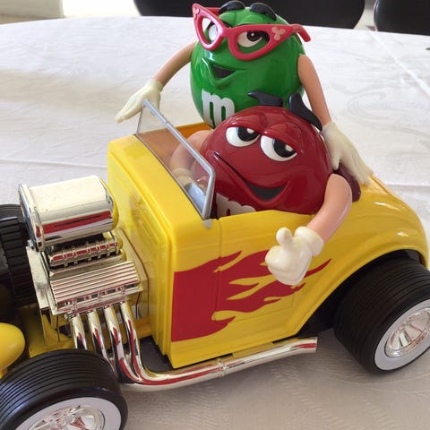 M&M’s dispenser. Blå figur med grøn chokolade knap i hånden. Fremstår meget flot. Se billeder