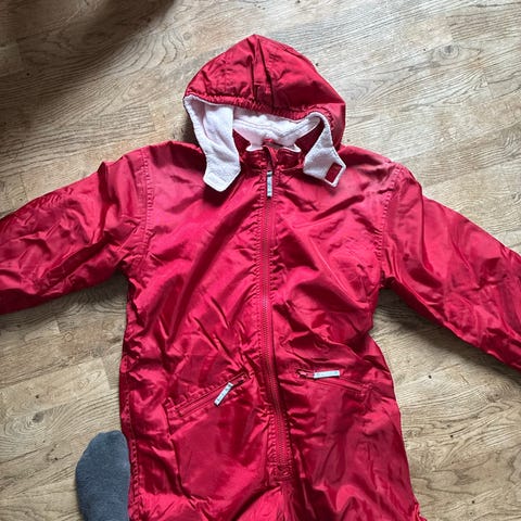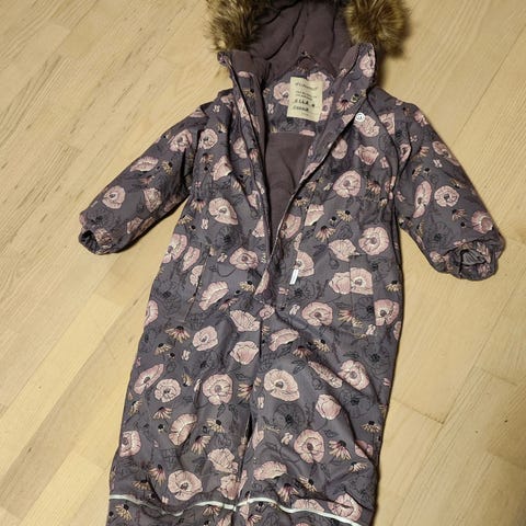 Mørkeblå Mimyno flyverdragt i str. 116, men virker stor i størrelsen. Den er slidt ved buksebenene.