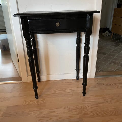 Afsyret Tobaksbord med to skuffer og en hylde i naturtræ. Bordet har drejede ben og en rektangulær bordplade. Velegnet som dekorativt møbel i hjemmet.