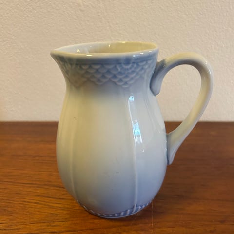 Bing & Grøndahl kande i porcelæn med blå blomstermønster. Kanden har et klassisk design og er dekoreret med håndmalede blå blomster. Velegnet til servering af væsker som mælk eller fløde.2sortering men et lille hak i kanten for oven kan indeholde 3 1/2 dl.