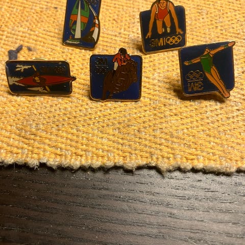 Sæt bestående af forskellige vintage pins og emblemer i metal. Indeholder blandt andet skoleemblemer og andre dekorative nåle med forskellige motiver og farver. Velegnet til samlere eller som dekorative accessories.