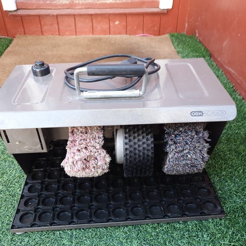 Professionel elektrisk skopudser fra OBH med tre børster, grov, moderat og fin.