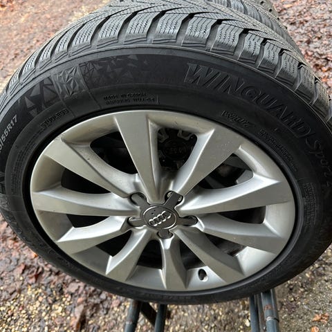 Sælge på grund af bilen er solgt. Fælge har nogle skrammel men er hverken skæv eller ujævn. 225/50R17 98V M+S. Passe også til mange andre Audi og VAG, check på nysynet.dk/hjuldata.htm DOT 4220, 4319, 3420 og 4319. Ca. 7mm mønster tilbage. Har altid opbevaret i mørk og kold.
