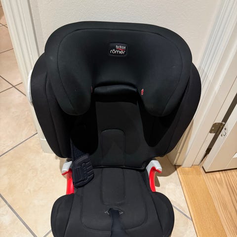 Britax Römer Autostol med en størrelse på 36 cm. Autostolen er grå og designet til børn. Den har polstrede sider og en sikkerhedssele. Stolen har en robust bagside og monteringsmuligheder til bilsæde.