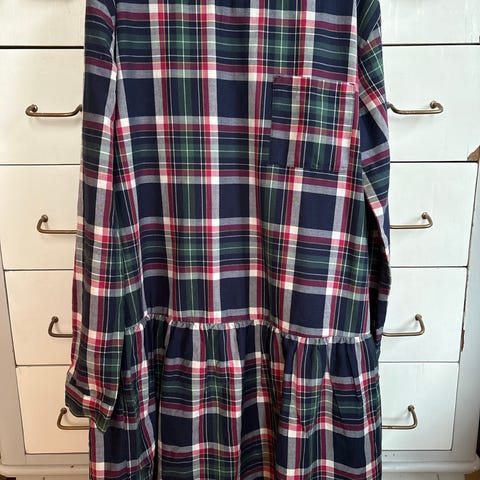 Flot mørkeblå skotskternet langærmet kjole med lomme foran. I fin stand. Str. 8-9 år/140.