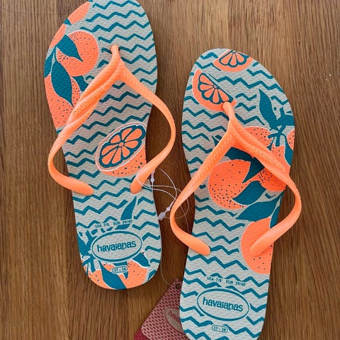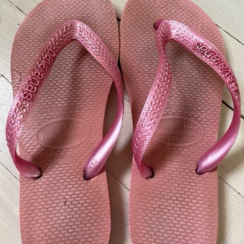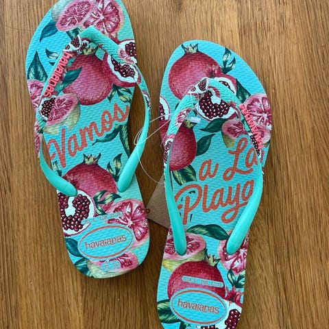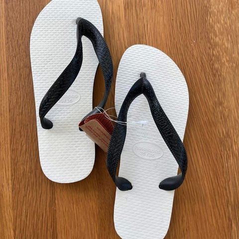 Havaianas Sandaler med hvid sål og sorte stropper. Sandalerne er lavet af gummi, hvilket gør dem lette og vandafvisende.