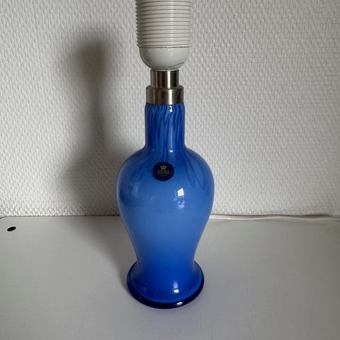 Lampe, Royal Copenhagen, Bordlampe model Torino i blåt mundblæst opalglas fra Holmegaard / Royal Copenhagen / Michael Bang - anno ca. 1970. Str. Stor - højde ca. 55 cm. I fin stand uden ridser. Sælges uden skærm.
