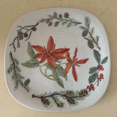 Porsgrund Porselæn tallerken med blomstermotiv i lyserøde og grønne nuancer. Tallerkenen er lavet af porcelæn og har en diameter på cirka 25 cm. Velegnet til hænge på væggen
