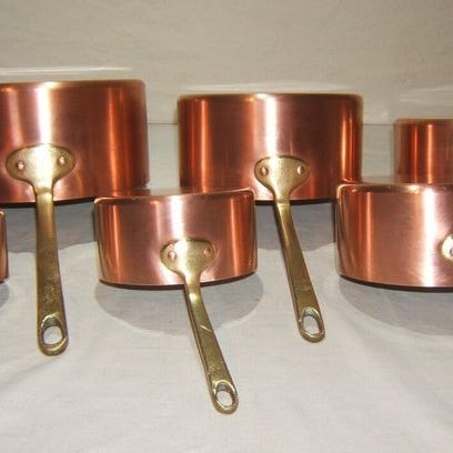 Godt, gammelt, fransk, gedigent kobbertøj.