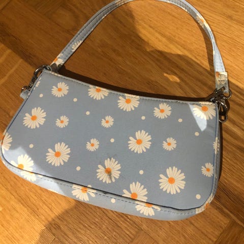 Håndvævet kvindetaske lavet af andre materialer med dekorative blomsterapplikationer i flere farver. Tasken har runde træhåndtag og en rummelig indvendig del med lukning. Velegnet til daglig brug og kan rumme personlige ejendele.