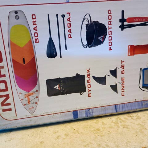 Starboard Stand Up Paddleboard med længde på 12'6" i blå og rød farve. Fremstillet i holdbart materiale, designet til brug på vand. Udstyret med finne under for stabilitet og elastik til opbevaring på overfladen. Velegnet til både begyndere og erfarne padlere.