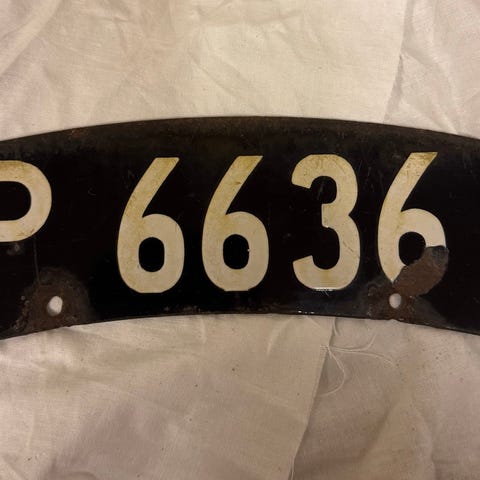 En fin gammel nummerplade fra/til en veteranmotorcykel. Den har siddet på forskærmen.