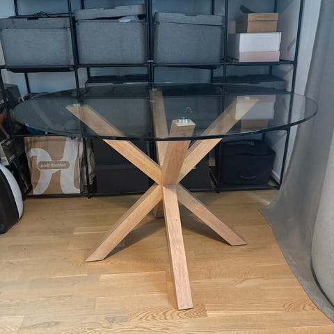 Bord med solid glasplade (uden ridser) og stabil ramme i bambus-/rottinglook.