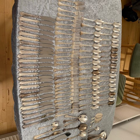 Frigast, Anne Marie, sølvplet bestik, middagsgafler, spiseskeer, teskeer, kagegafler, kagekniv, kagespade, sovseske, kartoffelske, marmeladeske og øloplukker.