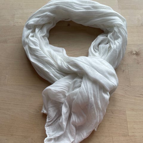 Hvidt luftigt tørklæde med guldkant til f.eks. stranden eller som alm halstørklæde. Ubrugt. Nypris 150 kr. Sælges for 95 kr.