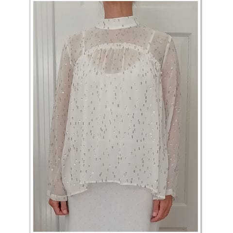 Storm & Marie SFA-55 bluse i multifarvet mønster. Størrelse M. Blusen har korte ærmer og bindebånd i bunden. Blusen er af silke, og blusen har et let og mønstret design.