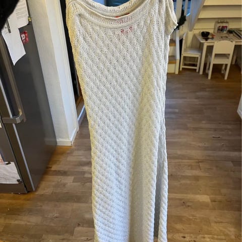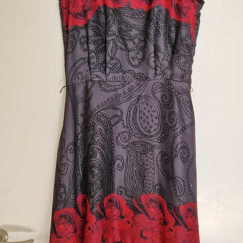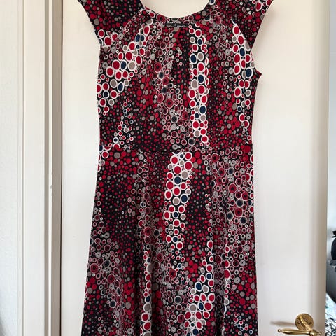 Desigual x Christian Lacroix lang, sort kjole med 3/4-lange ærmer og multifarvet mønster. Str. S. Kjolen er lagt 10 cm op, men kan lægges ned igen (passer 161 cm). Vaskemærket er syet med ind i oplægget, men det er tyndt, blødt og let gennemsigtigt stof. Ud fra hvad jeg kan se online, er det 100% viskose. Brugt få gange.