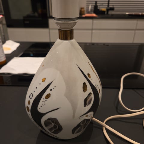 Lampe, AK Kaiser, Lampe med grafisk mønster på for- og bagside. Farverne er tonet ud i blå-grå-gul-grøn.