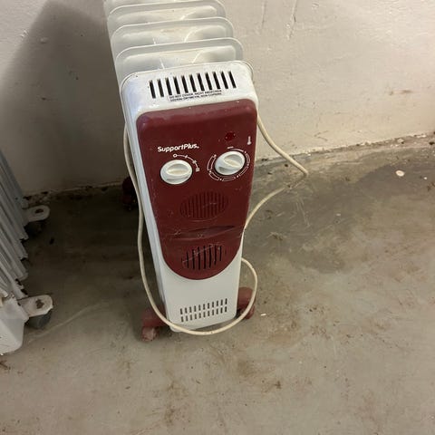 Okänd Oljeelement med 7 sektioner i vit färg. Utrustad med två rattar för temperatur- och effektinställning. Elsladd för anslutning till eluttag. Avsedd för uppvärmning av mindre till medelstora rum.