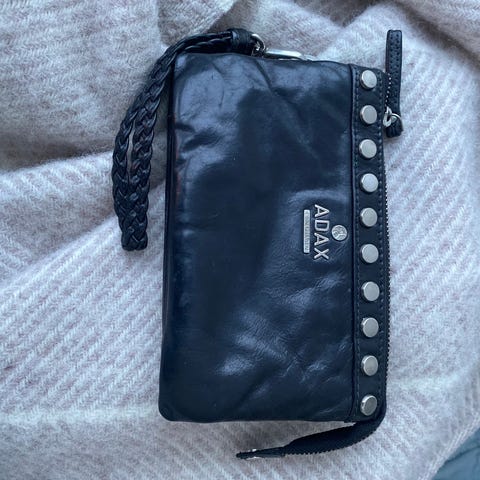 Lille taske fra ADAX i grå kunstlæder med fine nitter og flettet rem til håndleddet.