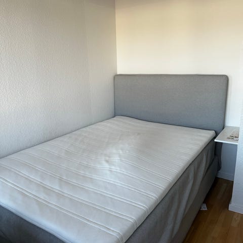 Jysk seng med madras og sengebund i størrelse 140x200 cm. Sengen har gråt betræk. Topmadrassen er hvid med en quiltet overflade og er ca. 7 cm tyk. Sengen har træben (19cm). Ca 2 år gammel, ingen pletter eller huller - så fremstår stort set ny.