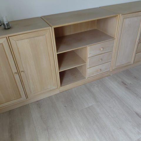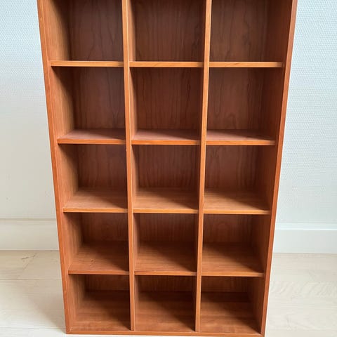 I bejdset træ. CD-reol. Vi har brugt den til børnesko, tørklæder og indkøbsnet.