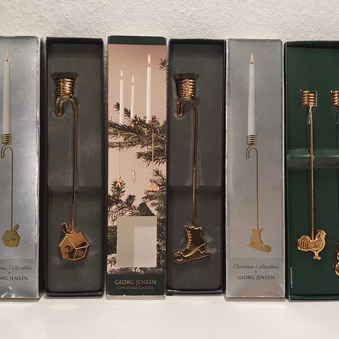 Sættet indeholder forskellige figurer som juletræ, bamse, hjerte, ged, gave, svane, klokke og peberkagemand, m.m. Lyseholderne er lavet af metal med en guldfinish og er velegnede til dekoration af juletræet.