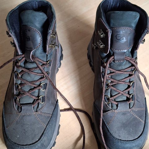 Rieker vandrestøvle i størrelse 39, farverne blå og sort. Fremstillet med robuste materialer og designet til at give støtte og komfort. Skoene har en slidstærk Vibram ydersål for godt greb og holdbarhed. Velegnet til udendørs brug og vandreture.