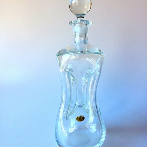 Kluk kluk flaske / klukflaske / karaffel af gennemsigtig glas med prop. Holmegaard. Højde inkl. prop 25 cm. I perfekt stand.