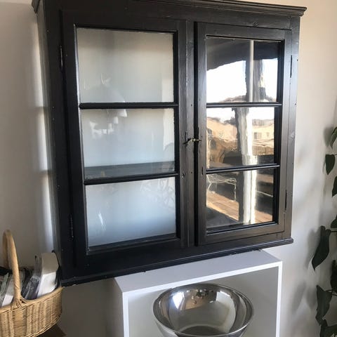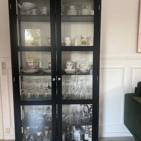 Flot sort vitrineskab, der sælges pga flytning. Det er malet blank sort for 7 mdr siden og det er indsat matering på glasruder, der kan afmonteres. Tre store hylder medfølger.