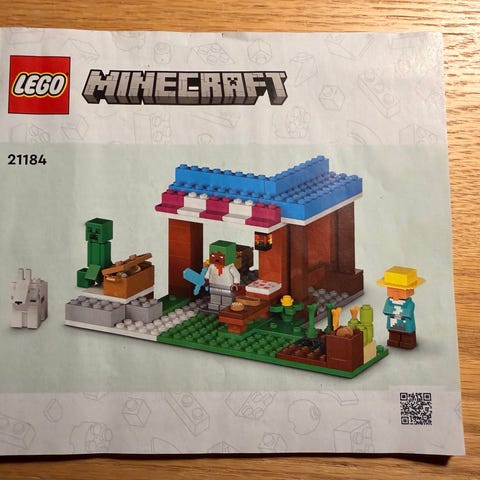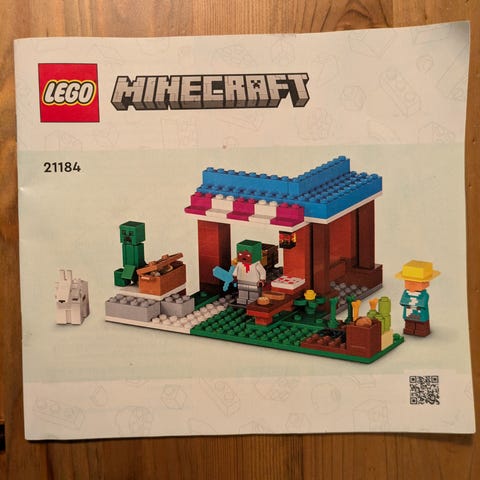 LEGO Minecraft Bygning og Figurer Legetøj inkluderer en lille bygning med tag, to figurer, en creeper, og forskellige tilbehør som planter og kister. Legetøjet er egnet til børn fra 8 år og op, og det er lavet af plastmateriale.