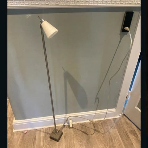Herstal Gulvlampe med blå lampeskærm og krom farvet metal stativ. Lampen har en rund, flad fod i krom og en konisk blå lampeskærm . Designet til brug som gulvstående belysning i hjemmet. Lampeskærm 30 cm høj 23 omkreds top 42 cm omkreds bund ( højde incl. Skærm 163 cm ) Fatning E27. Fra ikke ryger hjem og ingen husdyr.