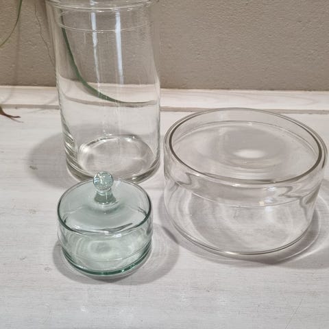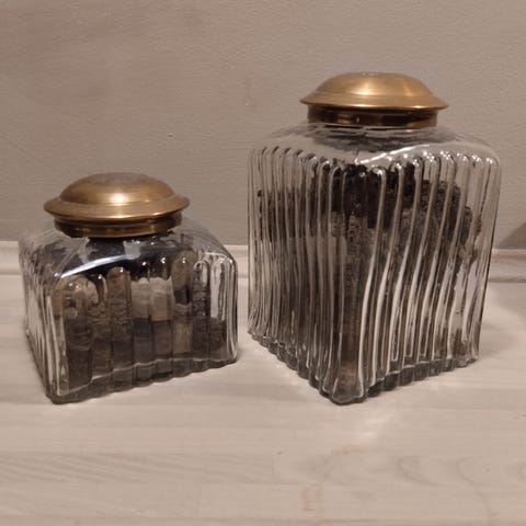 Gamle glaskrukker, to med låg. Måler mellem 16-26 cm i højden.