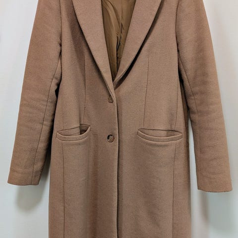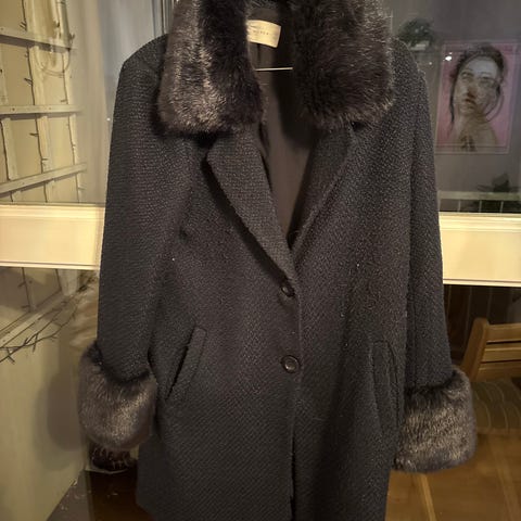 Neo Noir Frakke i størrelse M. Frakken er grå og lavet af blødt materiale, fake fur/pels. Den har en varm og komfortabel pasform, velegnet til køligere vejr.