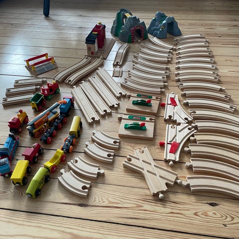 BRIO Starter Lift & Load Sæt børnetogssæt med 14 dele, der inkluderer togtog, kran og skinner. Sættet er designet til børn fra 3 år og op, lavet af træ og plastik i farverne blå, orange og naturtræ. Sættet giver mulighed for at bygge og lege med tog og kran, hvilket kan stimulere børns kreativitet og motoriske færdigheder.