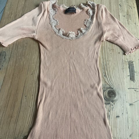 Zara T-shirt i størrelse M til kvinder i grøn farve. Materialet er blonder, hvilket giver en gennemsigtig og dekorativ effekt. T-shirten har korte ærmer og en rund halsudskæring med bølget kant.