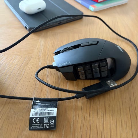 hej jeg sælger en Corsair Dark Core RGB trådløs gaming mus med sort finish. Musen har ergonomisk design, justerbar DPI, og RGB-belysning. Leveres med USB-modtager, opladningskabel og ekstra dele. Velegnet til gaming og almindelig brug.