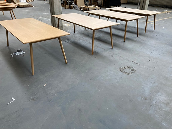 2 x FDB Møblers c62E med 2 tilhørende tillægsplader alt i olieret egetræ. Borderne har brugsspor og kosmetiske fejl og sælges derfor til nedsat pris.